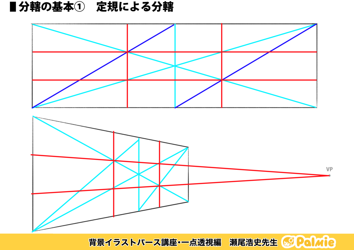 また、対角線を上手に使ってパースのはいった部分も等分割したり、増殖させたりしました。なんだか作図みたいでこれはこれでたのしいですね。たくさん練習課題があるので、最初はめんどうくさいなーって思っていたのですが、やっている間にだんだん定規になれてきたので、修行だと思ってやりこむのです。。。